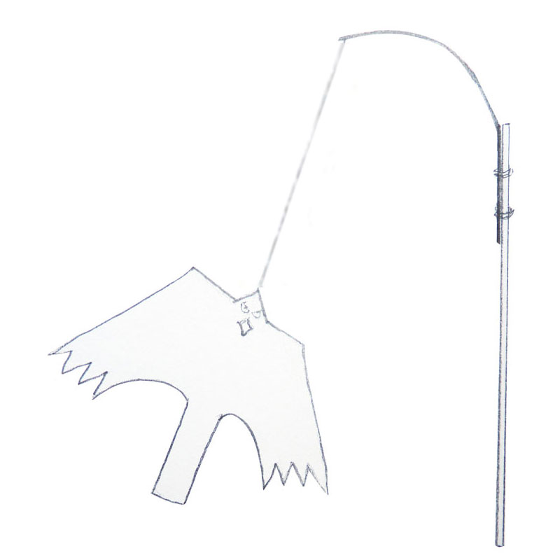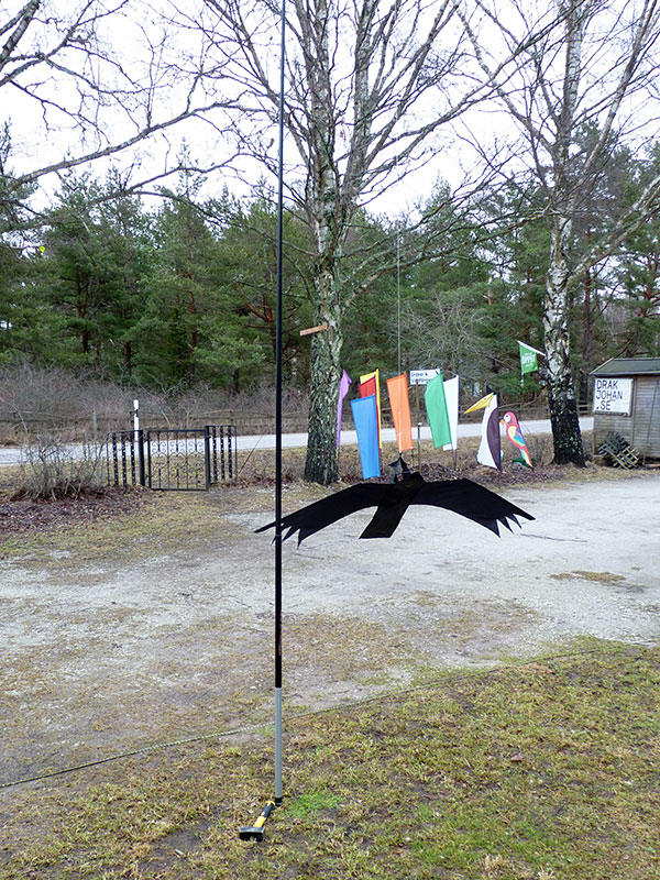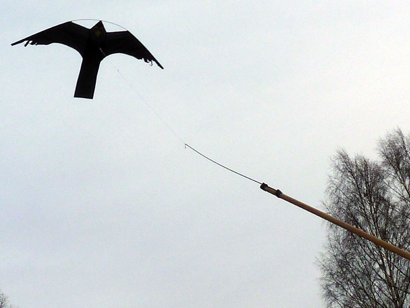 Man kan använda det fästet för fastsättning av linan från ett spö också. Fågeln kommer då att flyga rakt upp vid tillräcklig vind. Med det här fästet så slits den också fortare vid hård vind. Vid svag vind kommer den istället att hänga ”på rygg” med benen uppåt och inte röra sig så mycket.Ett standard teleskopmetspö spricker om du sätter fast det med klammer eller ståltråd mot en stolpe. Om man istället flyttar ”benfästet” till huvudet (där huvudet fäster mot bågen) så kommer den att röra sig även i svag vind och se mer levande ut. Den slits inte heller så mycket vid hård vind fär att den inte ”fångar” vinden som när den är fäst i ”benen”. Vi rekommenderar fästet i ”Huvudet” men man kan välja det man vill själv. Vid fastsättning i ”huvudet” rekommenderar vi att man använder en lekare för att undvika att linan blir snurrad.t ett standard teleskopmetspö spricker om du sätter fast det med klammer eller ståltråd mot en stolpe. Fästet där man kopplar fast linan bör vara av grov tråd eftersom det ”skaver” både mot draken och ev. metallhake på linan.