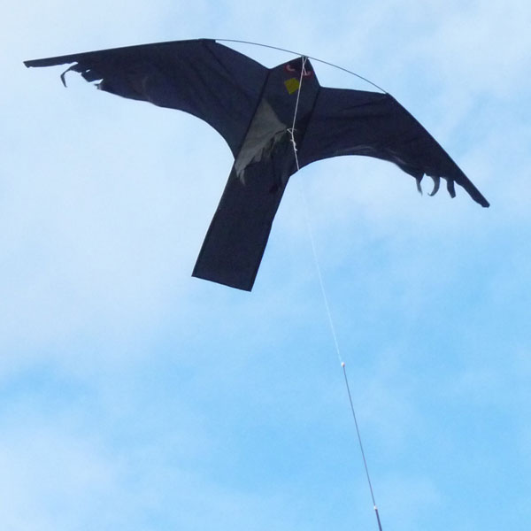 Blacky Hawk Rovfågel drake Fågelskrämma Bredd: 150 cm Höjd: 65 cm Material: Spinnacker polyester, kolfiberpinne 2 mm Polyesterlina, flätad, ca 4m/40kg Rekommenderad vindstyrka: max 12 m/s (Draken blir fortare utsliten i hård vind) |