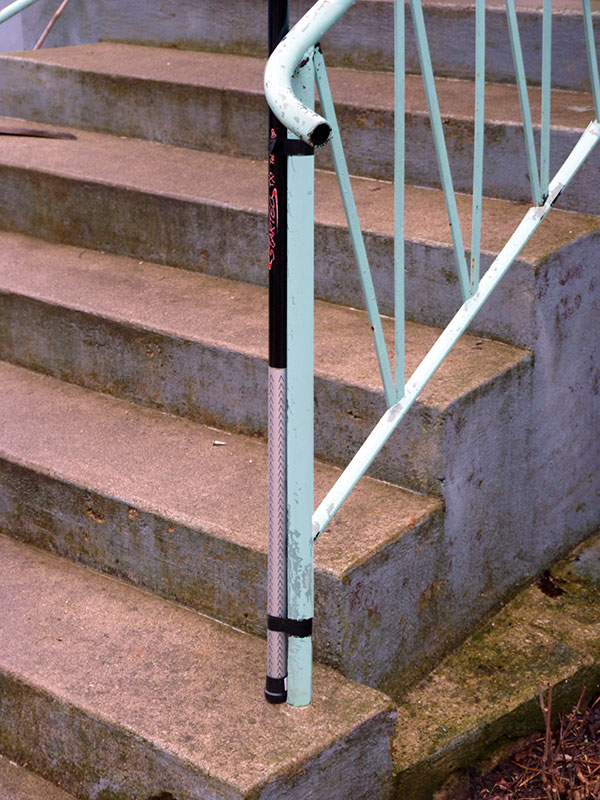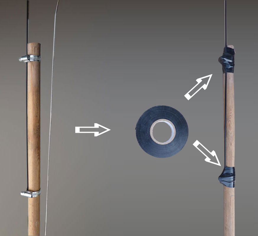 Om du fäster ett standard teleskopmetspö direkt mot en stolpe eller dyl så använd bara tejp. Det är väldigt lätt att ett standard teleskopmetspö spricker om du sätter fast det med klammer eller ståltråd mot en stolpe.