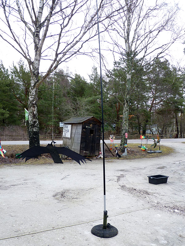 Alternativt kan man slå ner ett rör i marken att sätta stången i. Man kan också tejpa fast stången till t.ex. en staketstolpe. En stadig/tung parasollfot kan användas om det är hårt underlag. |