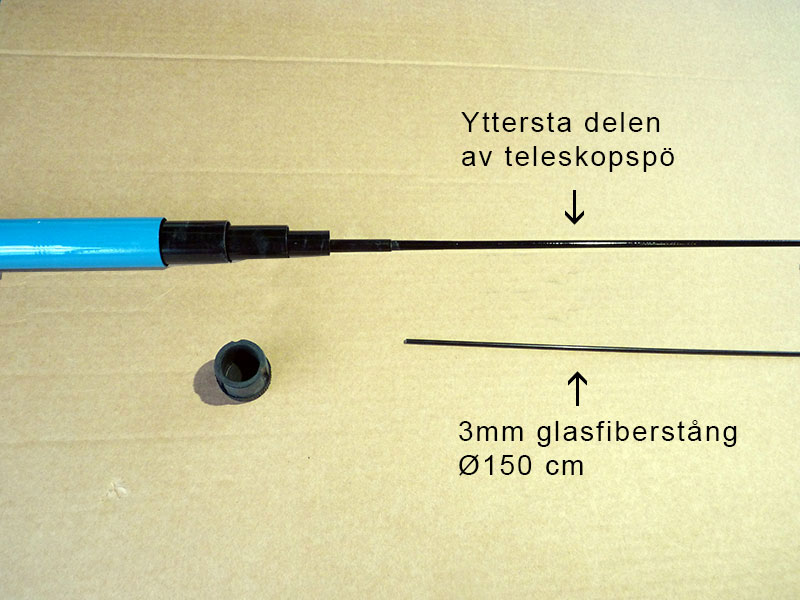 Så här monterar du en förlängning på ett teleskopmetspö som du sedan kan sätta upp en drake eller vindspel i (T.ex. en fågelskrämma som Blacky Hawk) Du behöver:Ett teleskopmetspö (funkar vanligtvis med standard kvalitet) av T.ex. 6 meters längd. En glasfiberstång Ø 3mm och längd 1,6 m (finns med monterad lina) Ca två meter svart eltejp. Börja med att dra ut toppdelen av spöet tills det ”Iåser” ordentligt mot nästa del. Det skall krävas ordentlig kraft för att lossa toppdelen så att den inte lossnar av sig själv. (kan limmas för permanent hopsättning). Placera glasfiberstången intill toppdelen av spöet så att nedre änden går 10cm förbi skarven till den andra delen av teleskopspöt. Börja linda tejp (ordentligt spänt) runt nedre änden av glasfiberstången och spöet 4-5 varv. fortsätt sedan att tejpa (”på snedden” så att tejpkanterna nätt och jämnt täcker varandra) stången hela vägen upp till spöspetsen så att toppöglan täcks av tejp och linda minst 4-5 varv på toppöglan innan du avslutar. Längden på linan att fästa draken i får avpassas efter hur långt draken får lov att röra sig sidledes. Lekaren med metallhake får du själv flytta på till lämpligt ställe på linan. OBS kapa inte lina förrän du är säker på vilken längd det skall vara. Bättre börja med för lång och sedan kapa. Linan får inte vara längre än att draken är en bit från marken vid vindstilla. Ibland kan man inte ha mer än en meter pga. av träd och hustak.