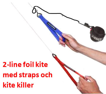 2-linors foil kite med bar Ett bra val som som andra kite för att få uppleva mer ”power”. Den här kiten levereras med en bar där linorna redan är kopplade så man kan börja flyga direkt utan att fundera på hur linor och bar skall fästas. Det går dessutom snabbare både att börja flyga och att packa ihop eftersom linorna lindas över ändarna på baren. Att flyga med en bar upplevs av många som lättare än med straps speciellt för nybörjare. Om du sen också vill använda foilen som en power kite (åka skridskor eller skidor t.ex.) så är det mycket lättare med en bar. En kite som hela familjen (från ca 12-14 år) kan leka med. Redan i måttliga vindar drar den ordentligt och i hårda vindar får även vuxna med erfarenhet en ordentlig utmaning när man lopar genom power zon. I svag vind lätt att flyga om man har erfarenhet från en mindre foil. I hårdare vindar är den ganska långsam. Det här är ingen kite för att göra snabba loopar med utan mest för att uppleva dragkraft. (Flyg först i svagare vindar och prova sedan i hårdare vindar allteftersom din erfarenhet ökar. Kan användas som ”power kite” i lättare vindar för t.ex. skridsko och landboard. I hårdare vindar för annat med lite större friktion t.ex skidor, spark, snowboard, kälke etc ( på glatt underlag) |